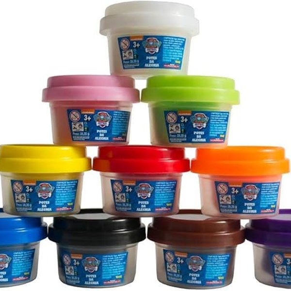 Divirta-se com os Potes da Alegria da Patrulha Canina. A embalagem contém um tubo com 10 minipotes de massinha