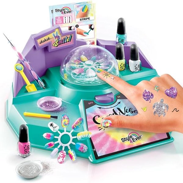Estação com esmaltes e decorações para as unhas. Coloque o glitter escolhido dentro da cúpula, depois insira o item que quer fazer brilhar, pode ser a cartela com tatuagens, as unhas postiças ou sua própria unha. Ligue a maquininha e veja o glitter voar e decorar o que você quiser! Vem com 1 estação com ventilador, 1 cúpula, 2 adesivos para decorar a estação, 3 esmaltes com cores diferentes, 3 potes com glitter, 1 cartela com mais de 100 adesivos para unha, 3 conjuntos de unhas postiças, 1 cartela de adesivos para colar as unhas postiças, 2 cartelas de adesivos de tatuagens, 1 pazinha, 1 pincel e 1 manual de instruções.